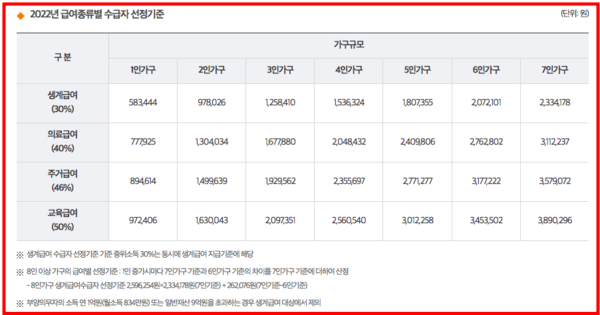 생계급여를 신청하는 가정은 매년 정부에서 고시하는 가구 월 소득의 최저생계비를 초과해서는 안됩니다. 가구 규모에 따른 2022년 기준 중위소득은 위와 같으며 소득인정액이 급여 종류별 수급자 선정기준 이하인 경우 자격이 주어집니다.