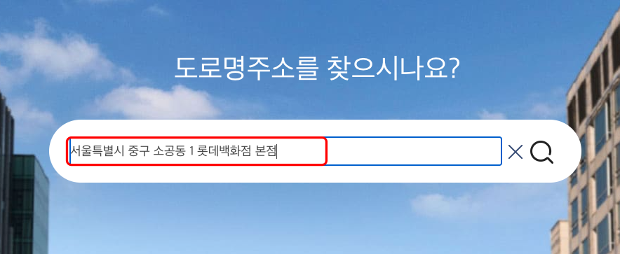 홈페이지가 표시되면 정중앙에 주소 입력란을 볼 수 있습니다. 이곳에 도로명주소 검색을 원하는 지번주소 또는 건물명 등을 입력하시기 바랍니다. 여기에서는 서울특별시 중구 소공동 1 롯데백화점 본점을 검색해 보도록 하겠습니다.