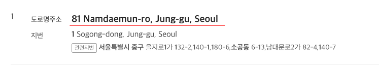 검색 결과를 확인하시면 중구 롯데백화점 도로명주소가 ‘서울특별시 중구 남대문로 81’로 검색되는 것을 확인할 수 있습니다. 또한 우측에서 우편번호를 확인할 수 있습니다.